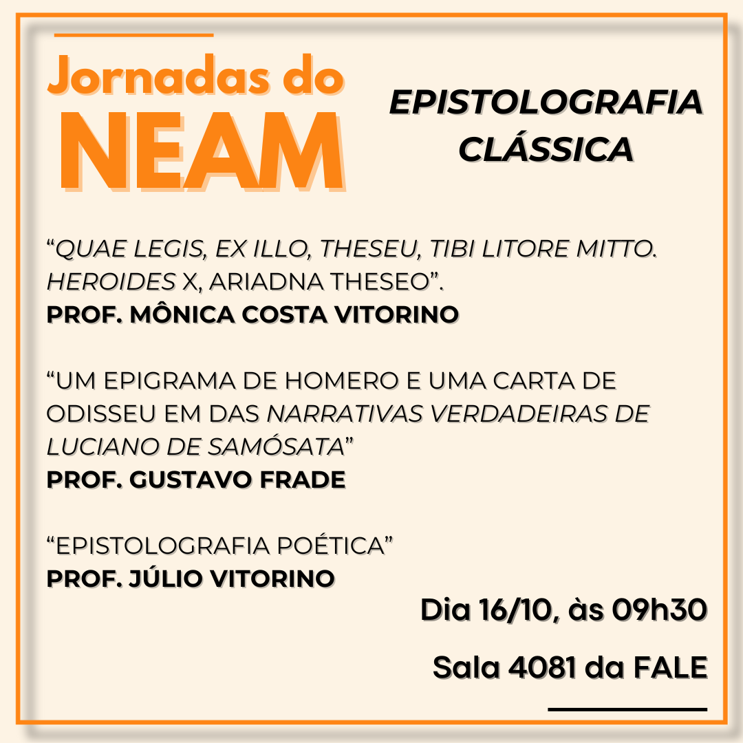 O NEAM – Núcleo de Estudos Antigos e Medievais da Faculdade de Letras convida a todos(as) para a próxima atividade das Jornadas do NEAM, com a temática “Epistolografia Clássica". A atividade será realizada nesta quinta-feira, 16/10, às 09h30, na sala 4081 da FALE.