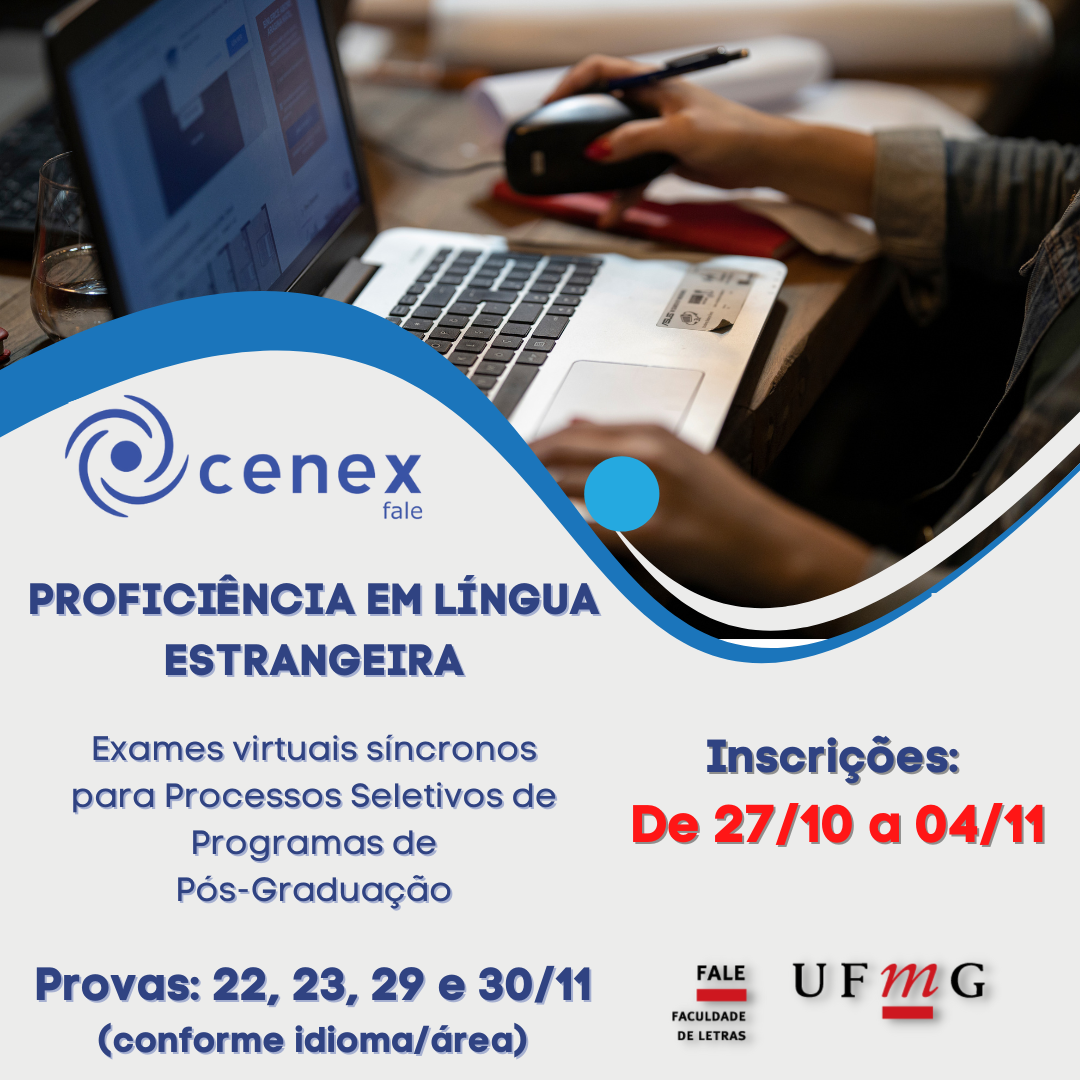 O CENEX/FALE - Centro de Extensão da Faculdade de Letras da Universidade Federal de Minas Gerais - divulga abertura de novo Edital para Exames de Proficiência em Língua Estrangeira Virtuais Síncronos, a serem realizados em NOVEMBRO de 2025, para processos seletivos de Programas de Pós-graduação.