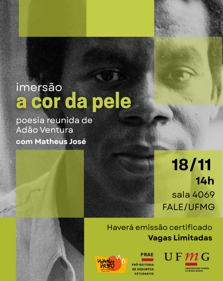 A Faculdade de Letras da UFMG (FALE) sediará, no dia 18 de novembro de 2025, às 14h, a oficina “Imersão A cor da pele: poesia reunida de Adão Ventura”. Conduzida por Matheus José dos Santos - discente da unidade e pesquisador da obra e do acervo do poeta -, a atividade faz parte da programação do Novembro Negro UFMG e acontecerá na sala 4069 da FALE.