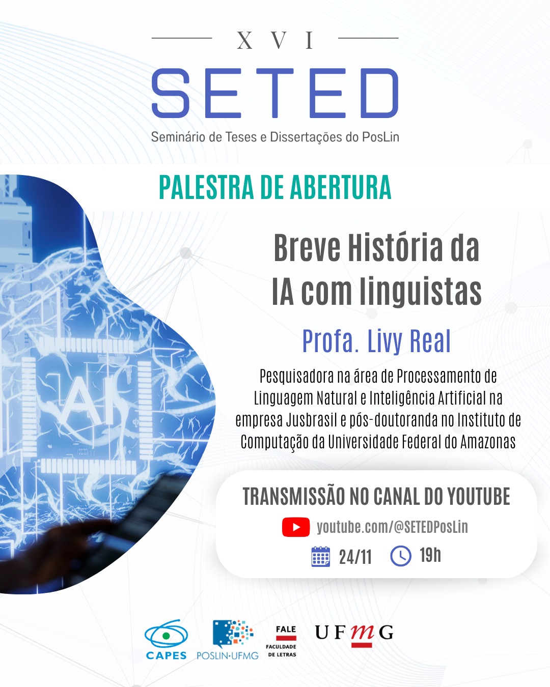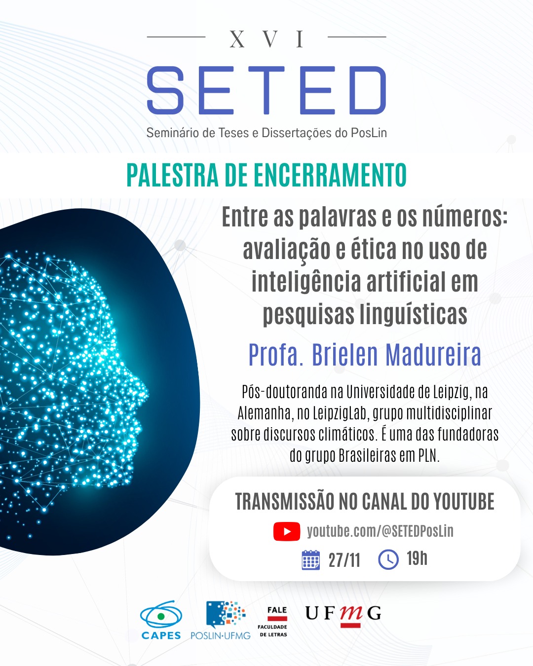 A representação discente do Programa de Pós-Graduação em Estudos Linguísticos (PosLin) da Faculdade de Letras da UFMG convida a todos(as) para o XVI SETED - Seminário de Teses e Dissertações, que ocorrerá entre os dias 24 e 27 de novembro de 2025. Assim como em anos anteriores, o evento tem o propósito de promover um espaço de diálogo entre pesquisadores, professores convidados e demais integrantes da comunidade acadêmica.