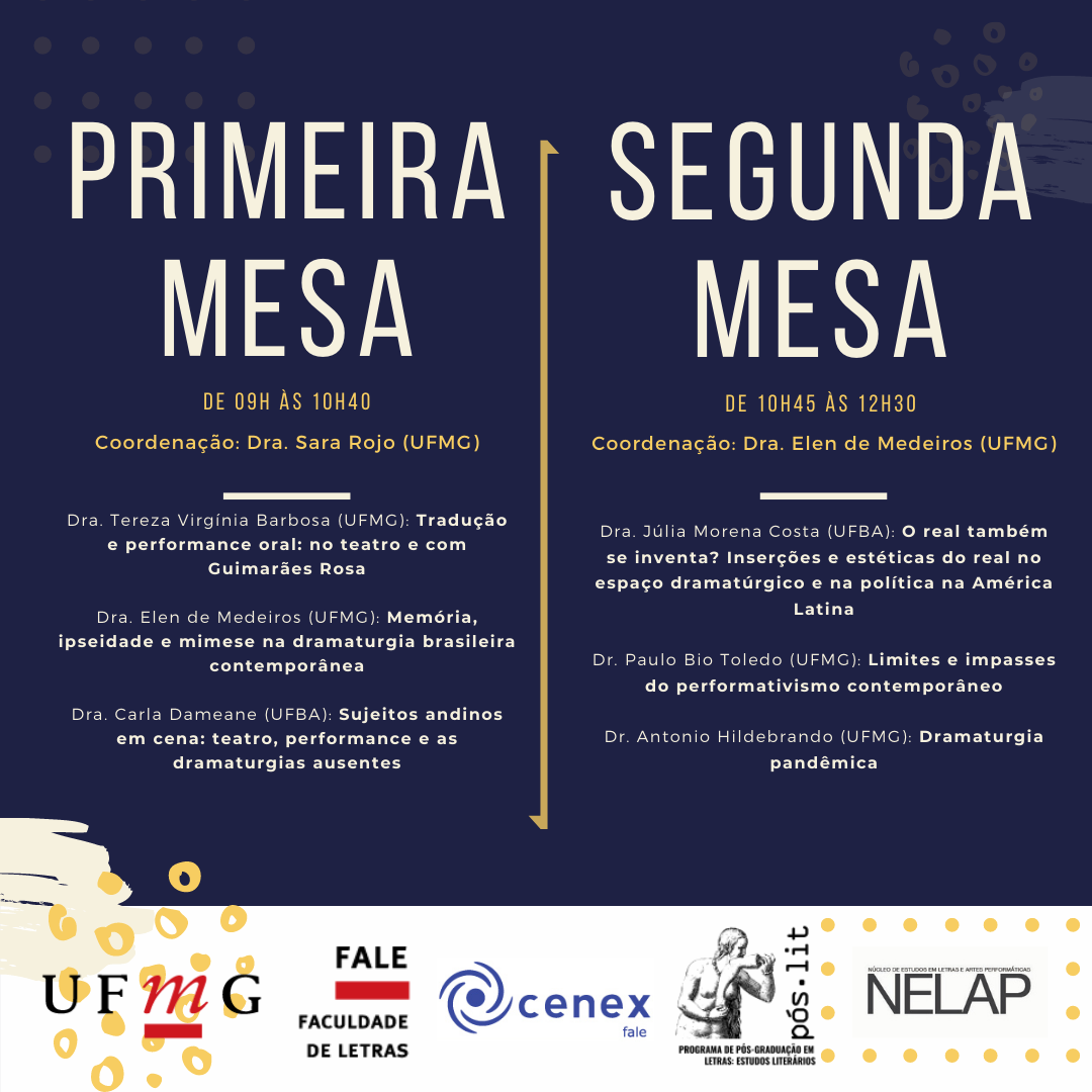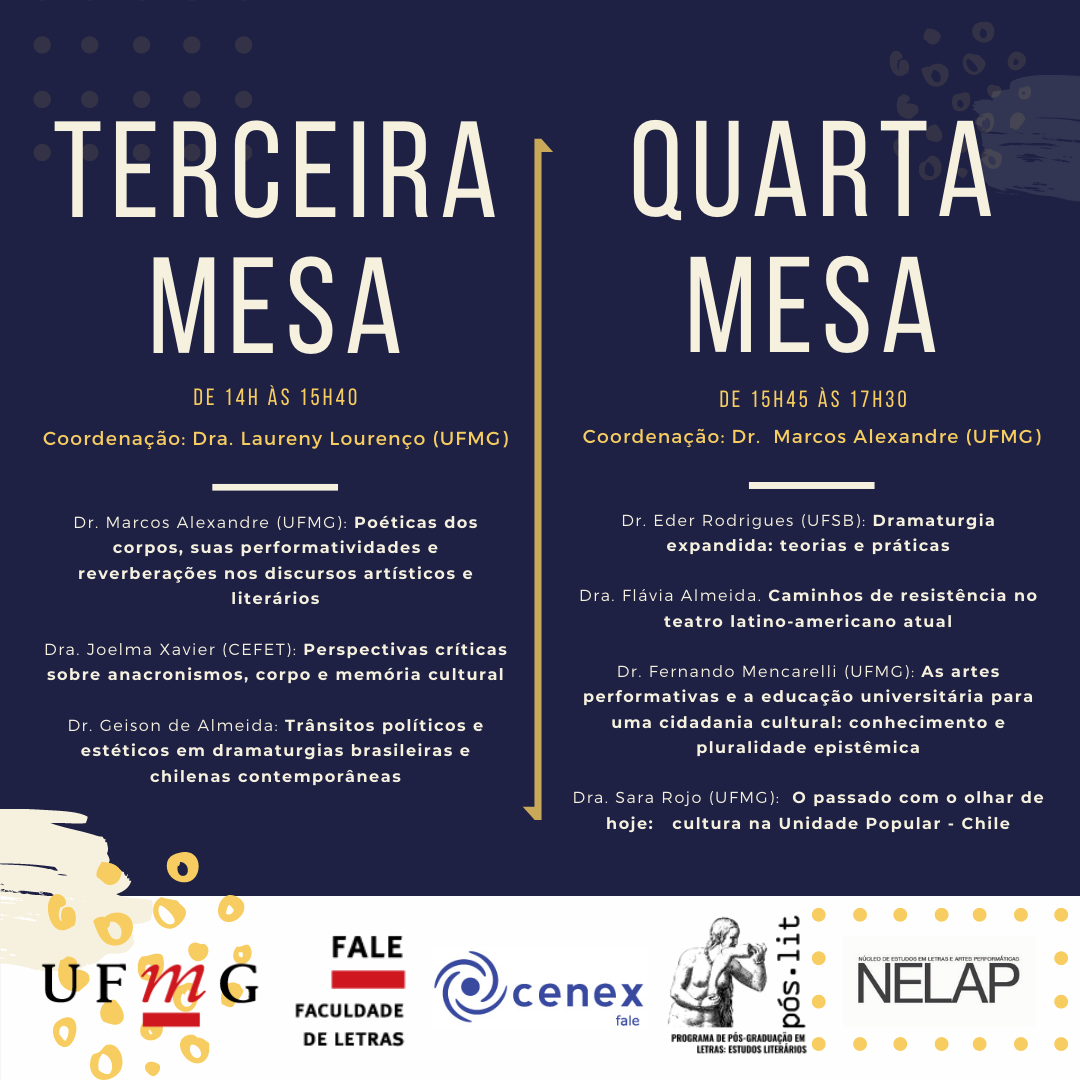 Quarta Mesa (15h45 às 1h:30): Dr. Eder Rodrigues (UFSB), Dra. Sara Rojo (UFMG) e Dr. Fernando Mencarelli (UFMG). Coordenação: Dr. Marcos Alexandre (UFMG).